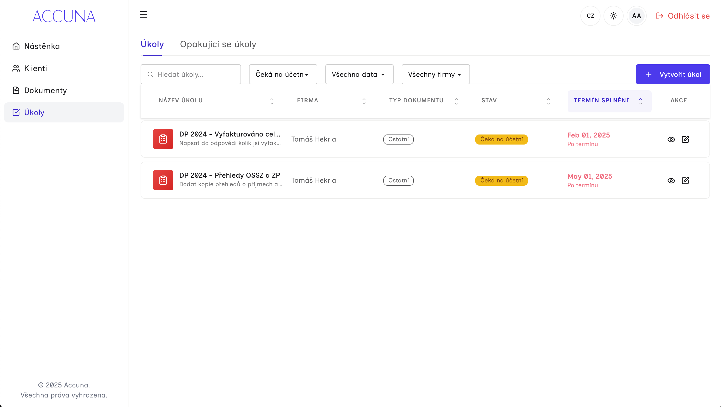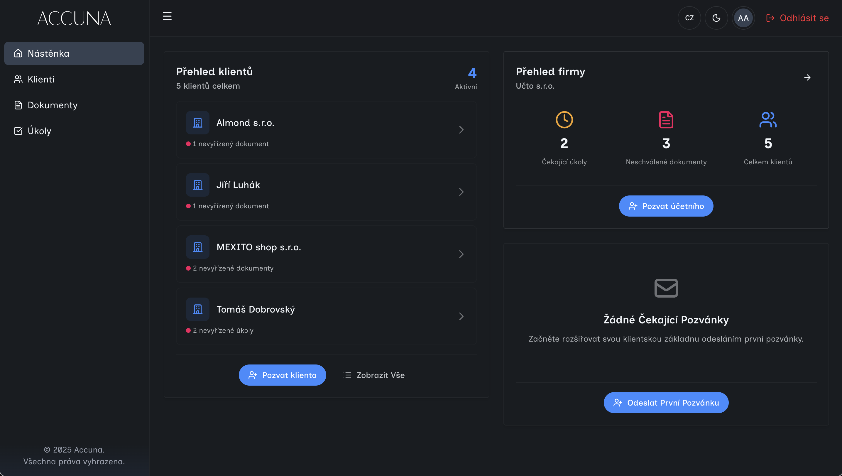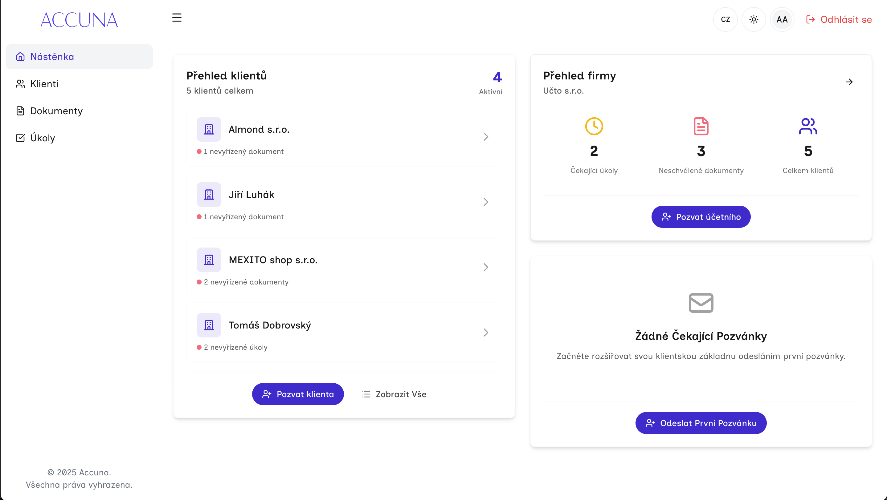 Accuna nabízí přehledné rozhraní navržené přímo pro potřeby účetních. Snadno spravujte klienty, dokumenty a úkoly prostřednictvím intuitivního ovládacího panelu a specializovaných nástrojů.