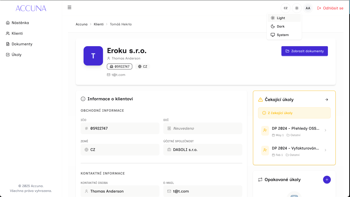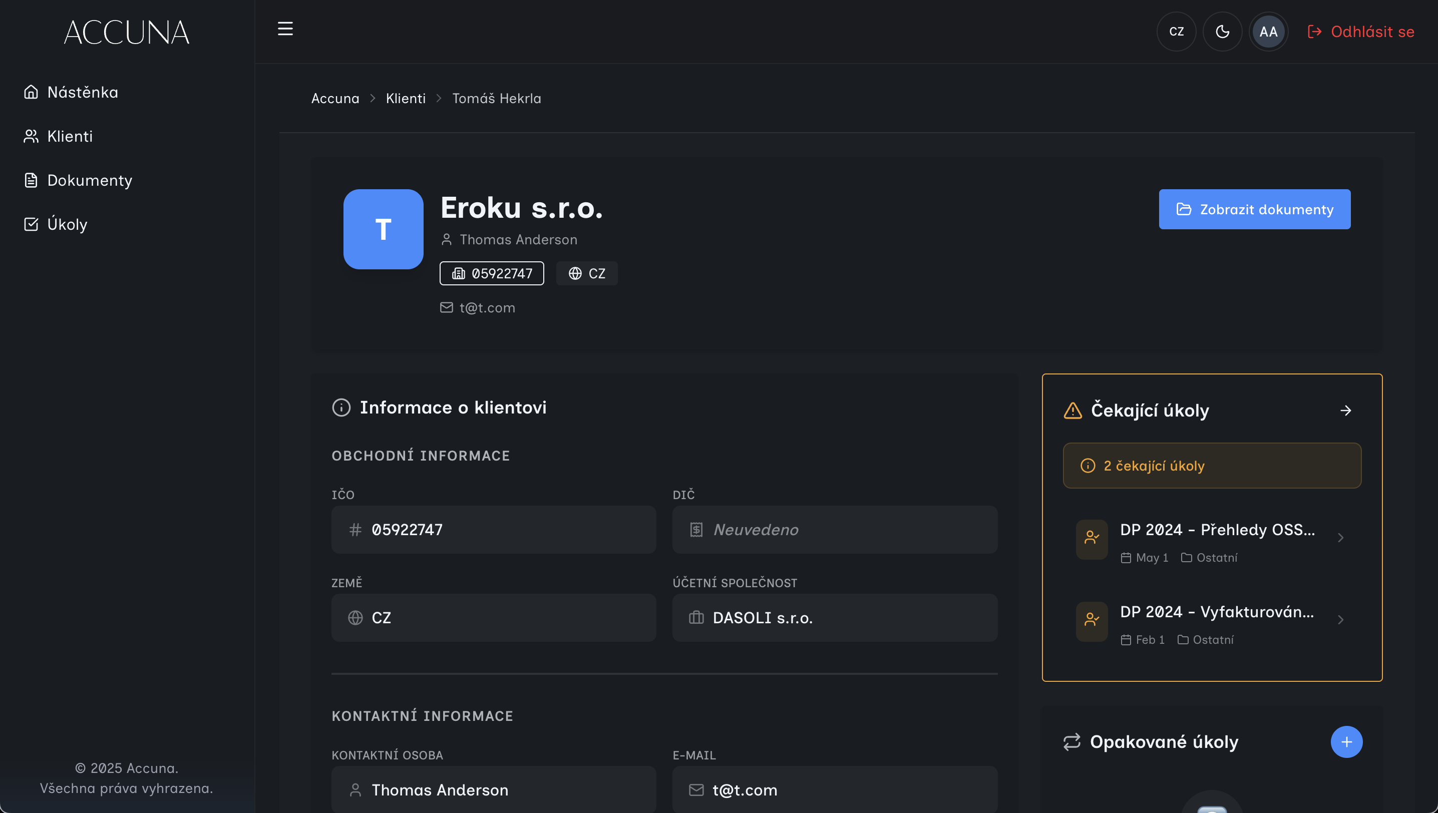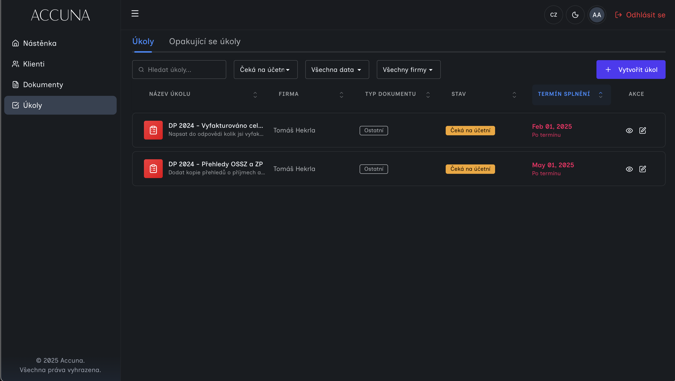 Accuna nabízí přehledné rozhraní navržené přímo pro potřeby účetních. Snadno spravujte klienty, dokumenty a úkoly prostřednictvím intuitivního ovládacího panelu a specializovaných nástrojů.